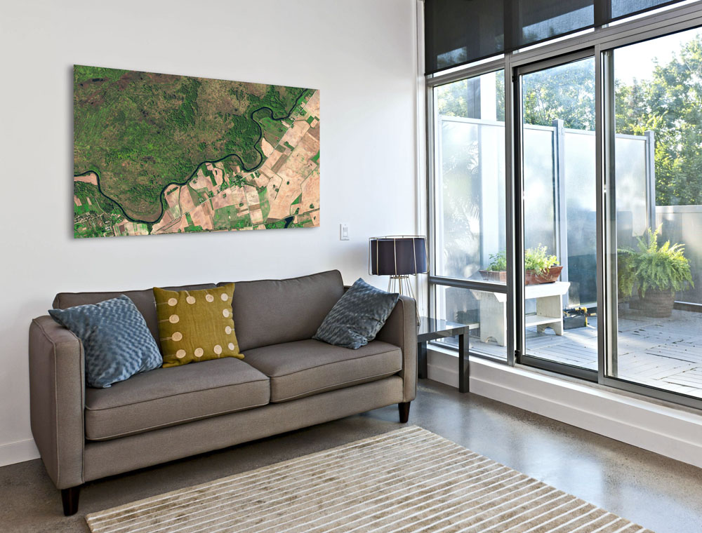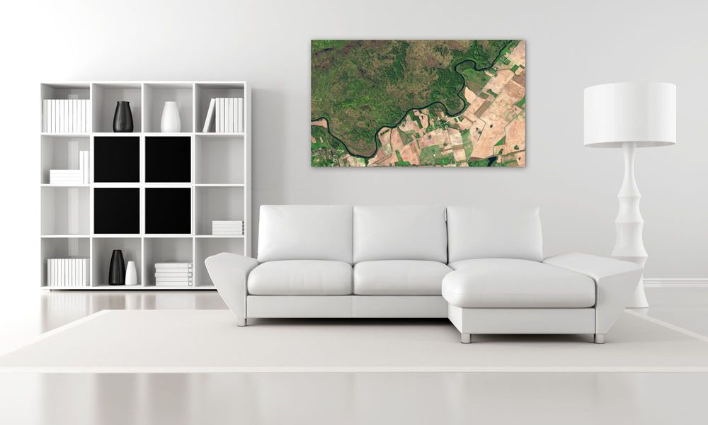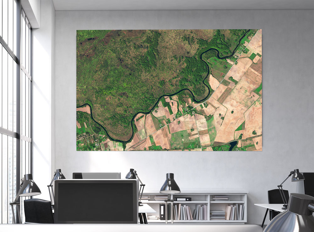Die Šešupe bildet im Osten Kaliningrads den Grenzfluss zwischen Litauen und der russischen Exklave. Im Satellitenbild wird der Unterschied zwischen den Landnutzungen auf beiden Seiten der Grenze deutlich. Während die litauische Seite von intensiver Landwirtschaft geprägt ist, sind auf russischer Seite die Folgen des früheren Status als militärisches Sperrgebiet erkennbar.