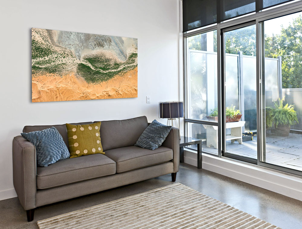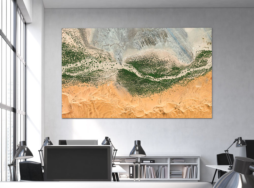 Die durch Oxidation des Eisens rötliche Farbe des Sands ist für die Namib charakteristisch. Damit kontrastiert sie, wie hier an der Fluss-oase des Kuiseb, mit der umliegenden Landschaft. Der die Namib im Norden begrenzende Kuiseb führt in dieser trockenen Umgebung nur etwa alle zehn Jahre Wasser bis zur Mündung in den Pazifischen Ozean. Entlang seinem Verlauf haben die Entnahme von Grundwasser und Überweidung durch Ziegen zu einem Rückgang der Vegetation geführt.